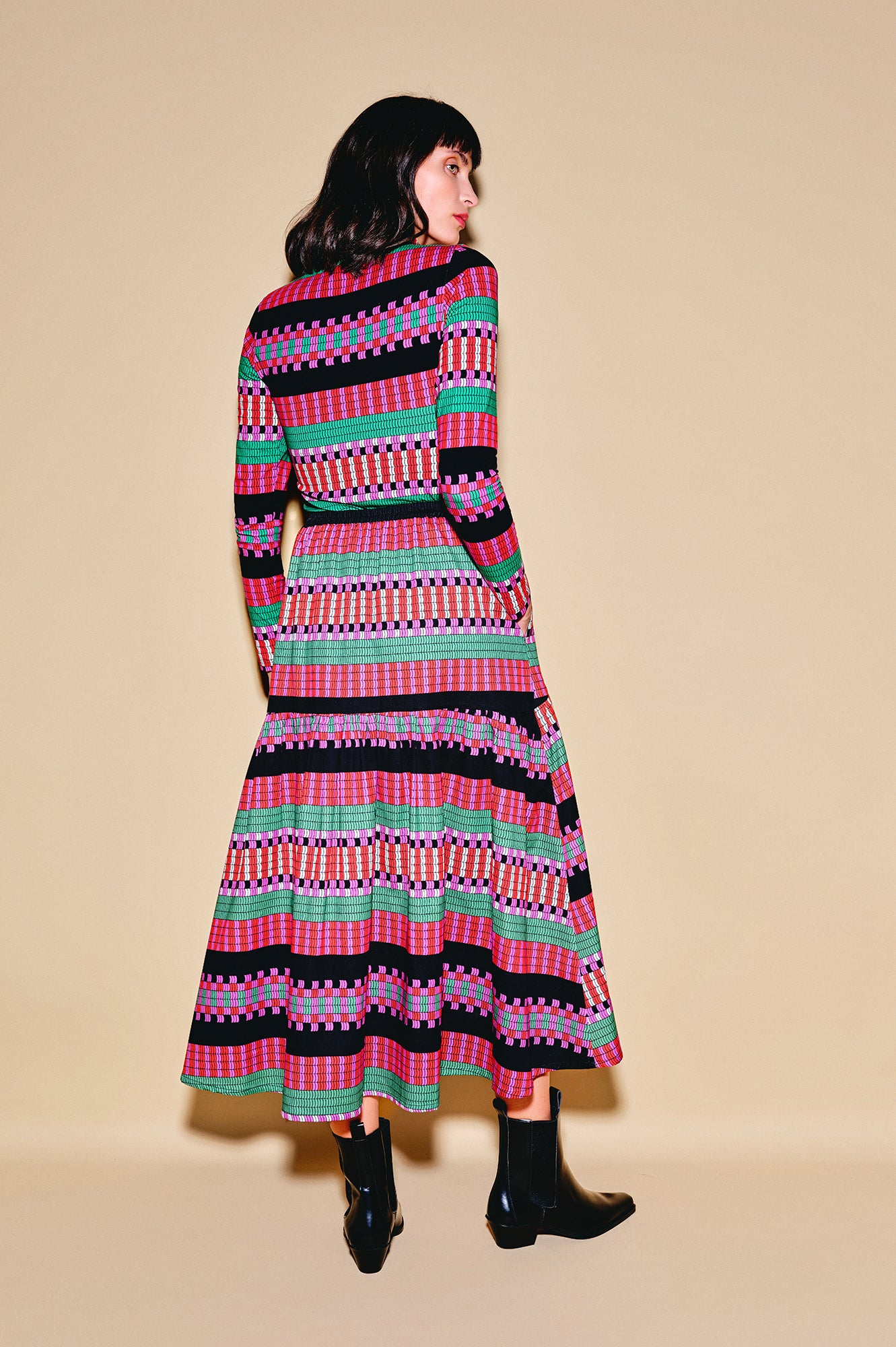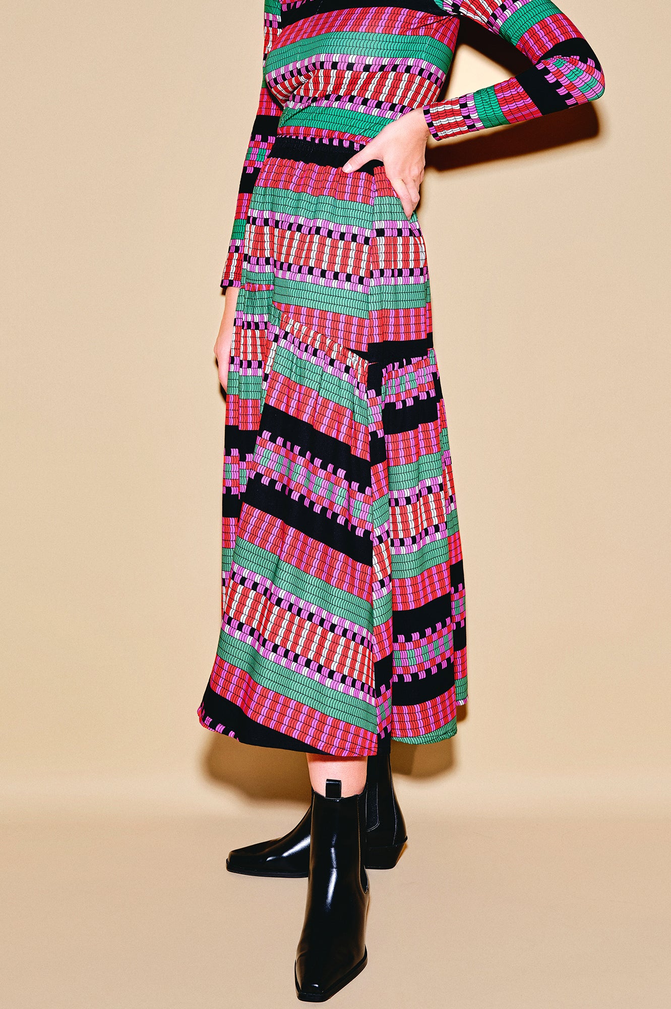 Made from soft, heavier cotton for winter, this ankle-length skirt features folk-inspired detailing and a ruffled hem for added volume. Elasticated band secures the waist, while side pockets add everyday practicality. A light, easy-to-wear piece with playful character.