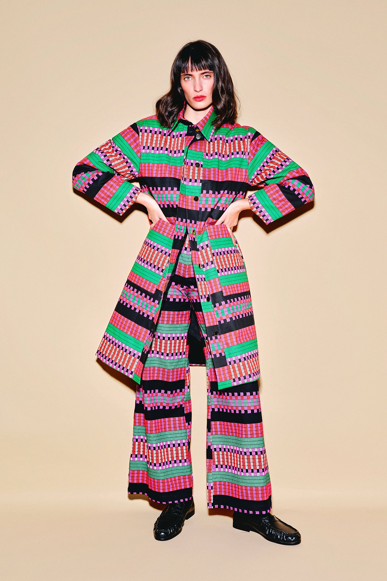 This garment was made in sustainable production. It took 9 hours for one cutter and one seamstress to make it. The fabric was made in Spain.